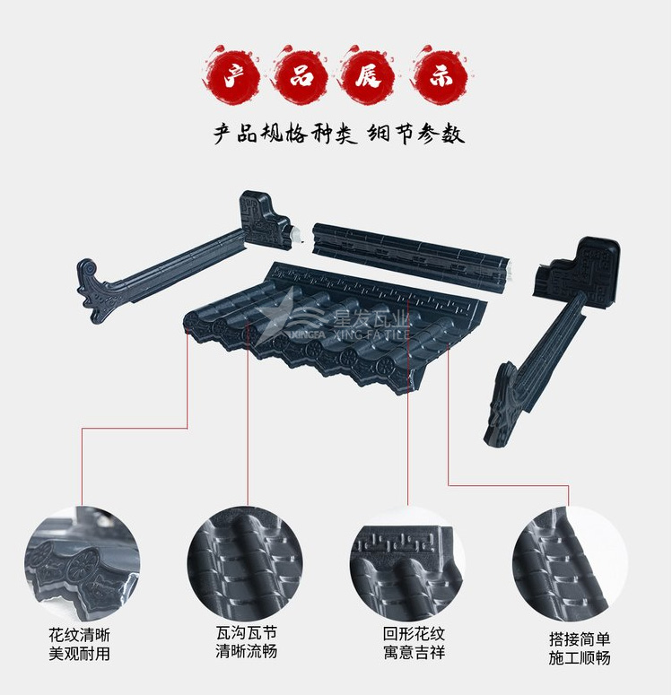 一體仿古瓦又叫仿古瓦,復(fù)古瓦,又名一體仿古屋檐樹脂瓦。外觀極具古典美感、經(jīng)久耐用,適用于自建房、別墅。