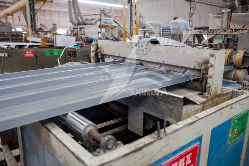 擠出成型后的片材需要經(jīng)過一系列的后續(xù)加工才能成為我們常見的樹脂瓦。首先是對擠出成型后的片材進行切割,使其長度符合實際需求。然后,對切割好的片材進行壓型,即將其放置在模具上,通過加熱和壓力使其形成波浪形的表面。這一步的目的是使樹脂瓦表面呈現(xiàn)出自然的瓦楞紋理,提高其美觀度和抗壓性能。壓型好的片材進入恒溫恒濕的設備中進行固化,使其內(nèi)部的PVC分子鏈逐漸交聯(lián),從而提高其硬度和強度。